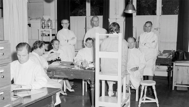 På bildet vises en hudpasient frem for et legekollegium i 1951. Fotografiet er tatt av en ukjent fotograf ved Universitetets fototekniske avdeling, Rikshospitalet.