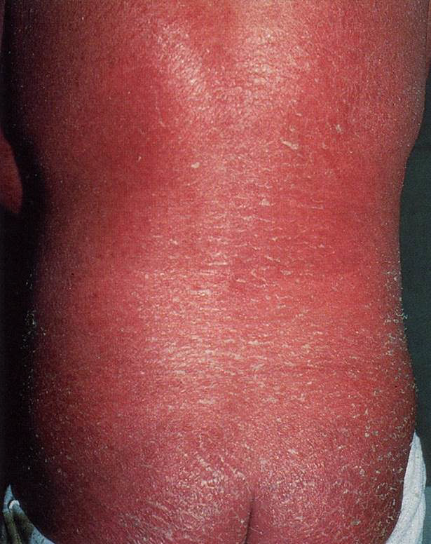I sjeldne tilfeller kan huden over hele kroppen bli rød og vi kaller tilstanden " erytrodermi ", som betyr "rød hud". Erytrodermi er ikke en sykdom i seg selv, men snarere en beskrivelse av en tilstand hvor mer enn 90 prosent av huden er betent.