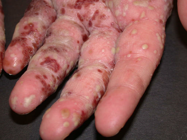 Eksempel på generalisert pustuløs psoriasis (GPP) i håndflaten.