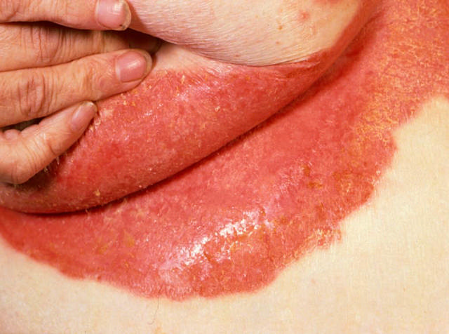 Eksempel på en mer alvorlig grad av invers psoriasis under bryst.