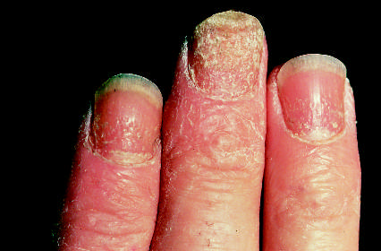 Symptomene kan variere fra milde til alvorlige og kan forveksles med soppinfeksjon. Løse og fortykkede negler kan gi voldsomme smerter ved den minste berøring. Det kan være praktisk umulig å bruke hendene og i alvorlig tilfeller kan det være direkte invalidiserende.